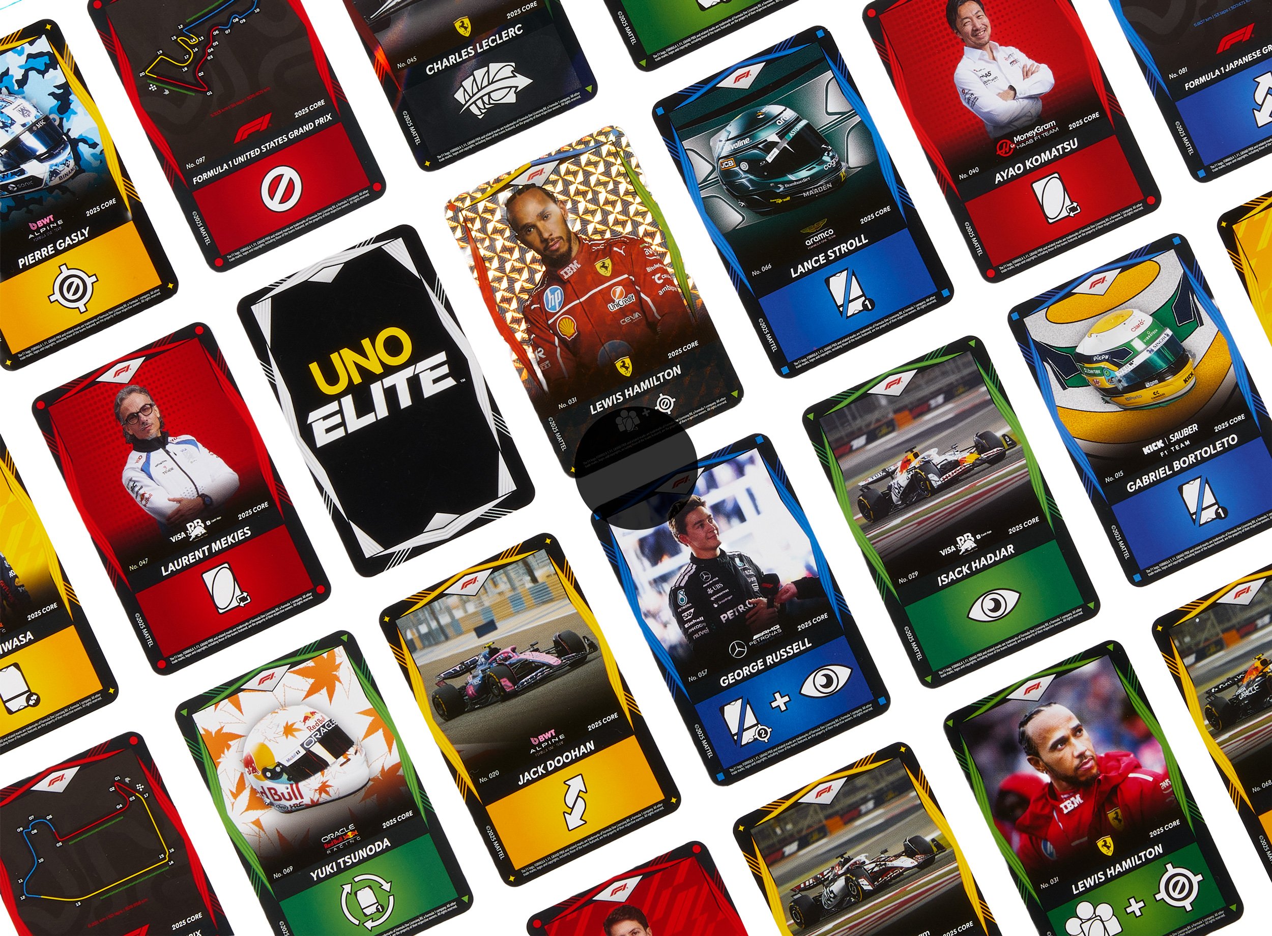 Bring the thrill of Formula 1 to the UNO card game with the officially licensed UNO Elite Formula 1 edition. From lights out to the checkered flag, this high-energy collaboration was fueled by bold key art, a merchandising guide, and social content.